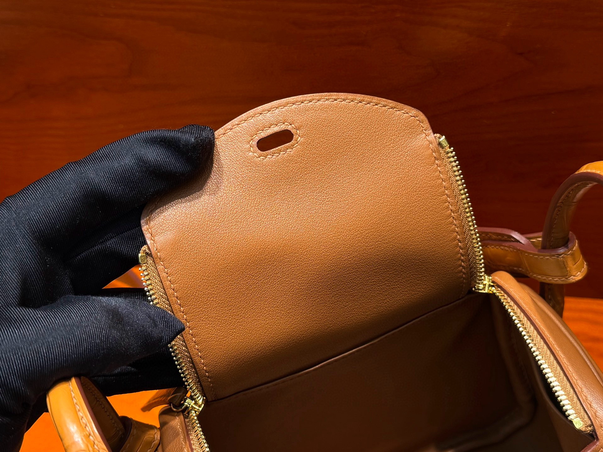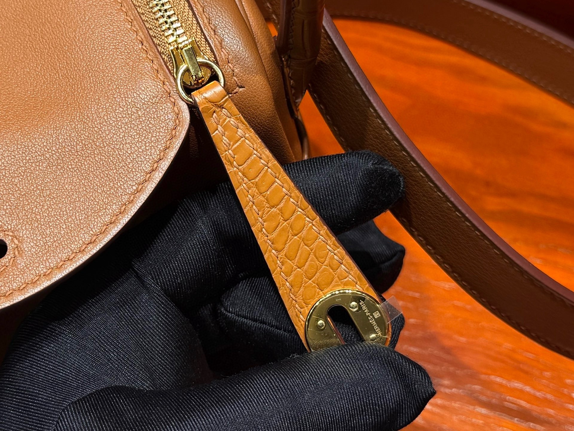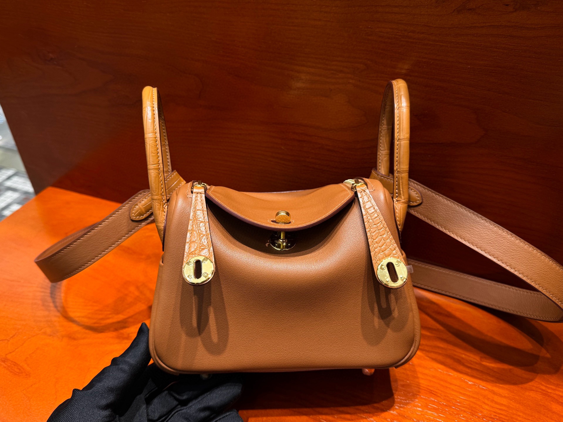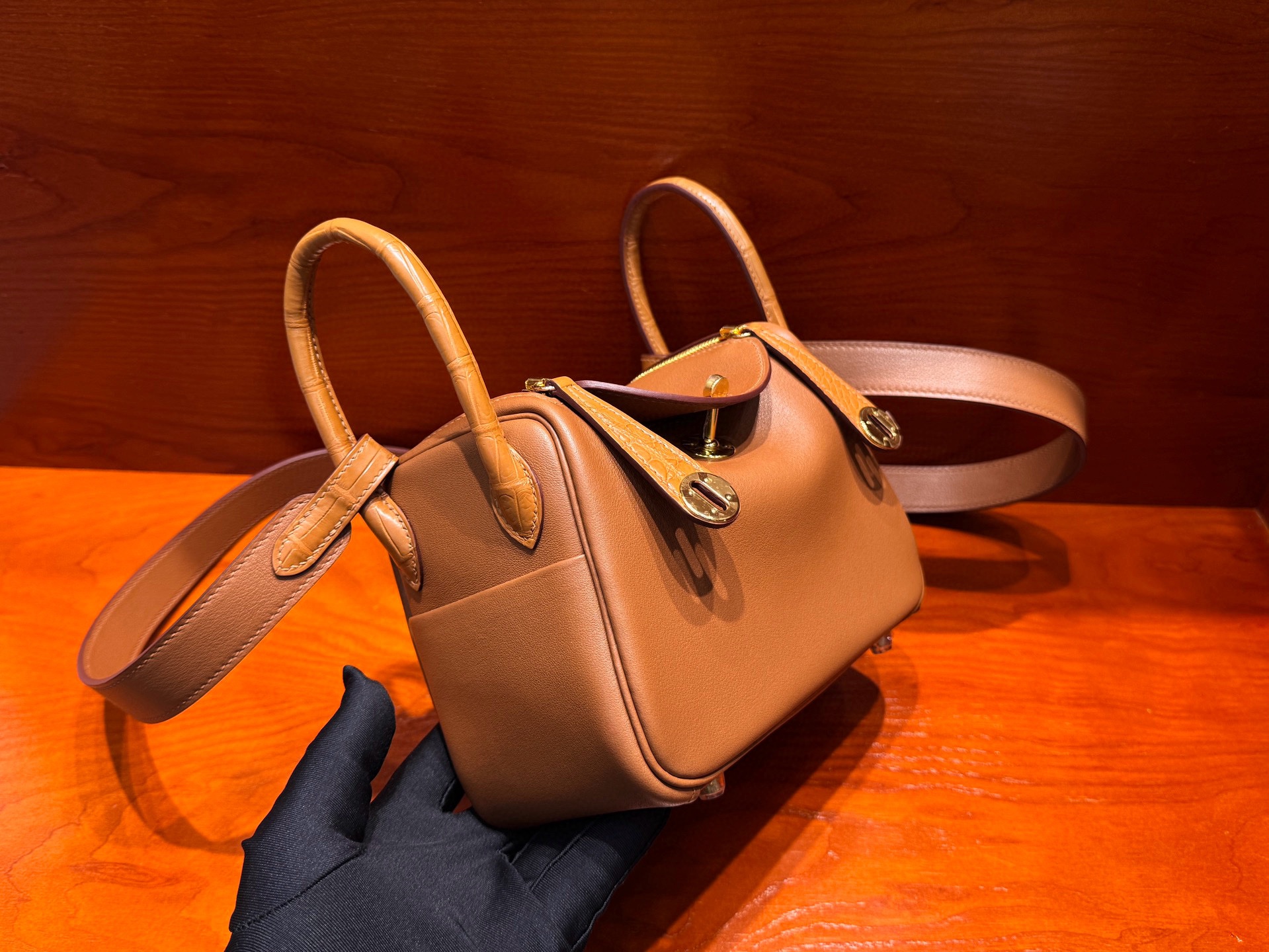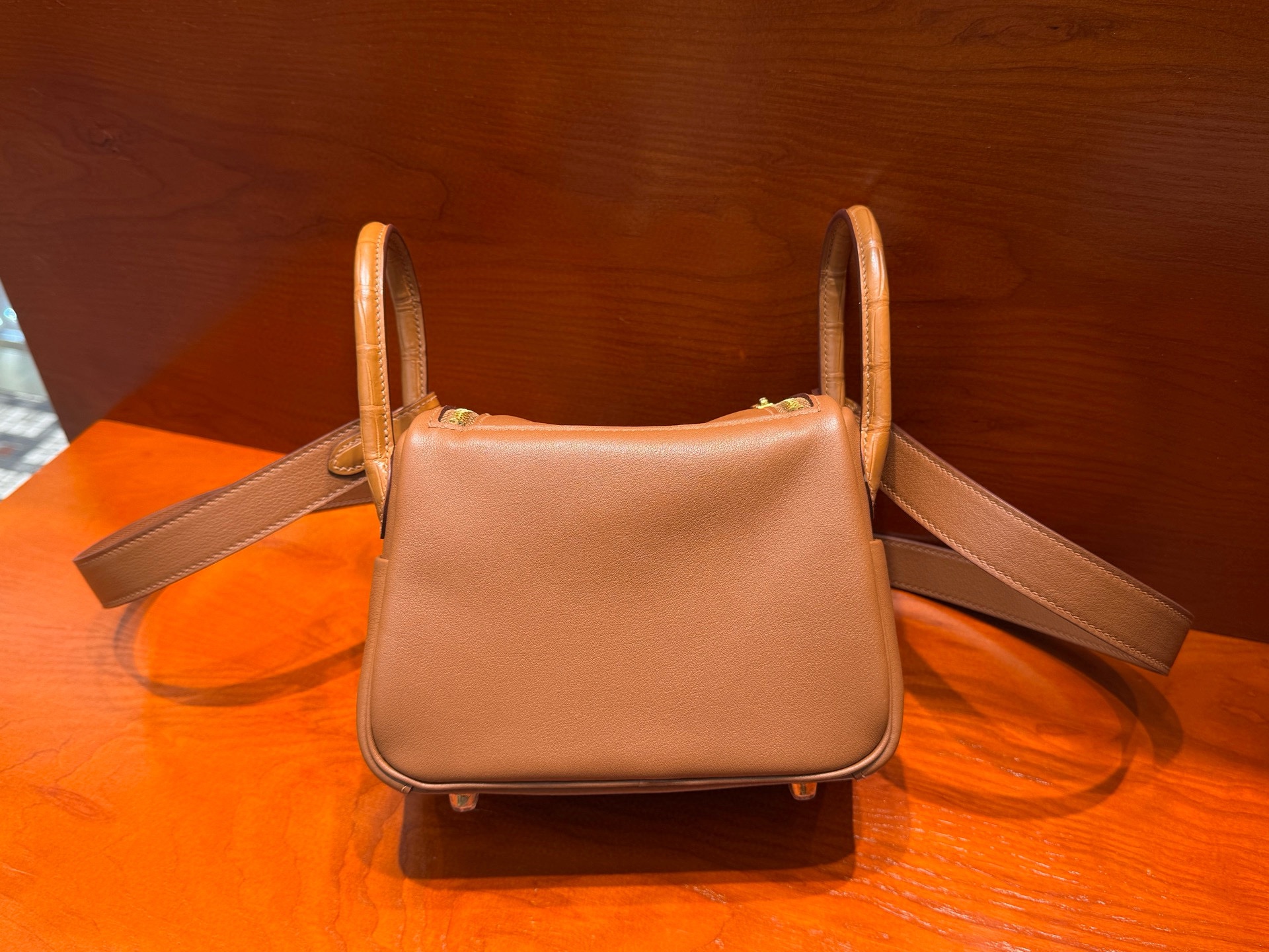 Lindy mini 19cm crocodile leather and swift leather 37 gold golden brown top